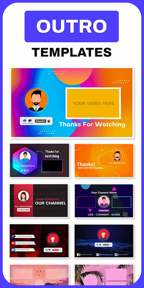 Intro Maker, Video Intro Outro owns many templates with different designs that help users create impressive intros and outros. Each type of video has different properties and is fine-tuned, and can get more interesting content, effects, and icons. At the same time, users can also adjust the audio clips to create a good impression on the viewers when starting the videos.CREATE INTRO AND OUTRO EASILYIn Intro Maker, Video Intro Outro, users will find features that make it easy to create completely impressive intros and outros without any difficulty. That comes from the ability to use pre-designed templates, and use