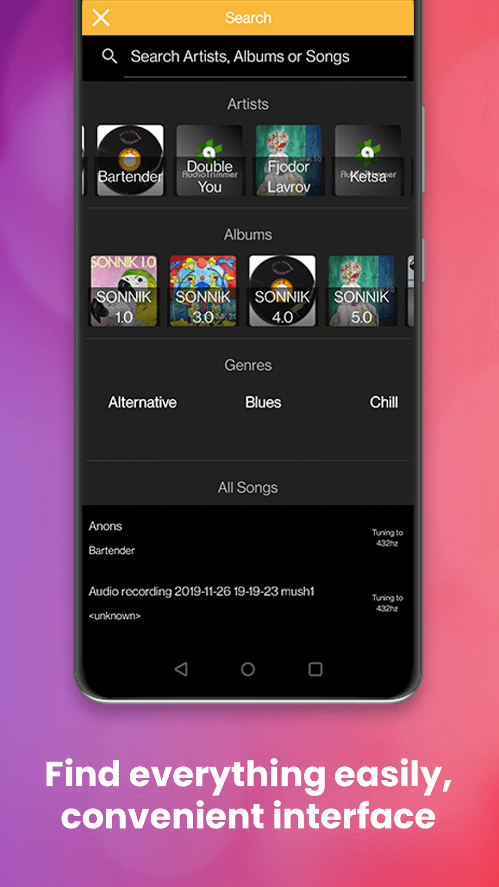 Your phone has the potential to become the best listening environment possible for the music of various tones and tempos if you have a high-quality music player app that is filled with exciting extras.The app becomes an impressive music listening tool with powerful adjustment features. Everyone can choose their own experience by making available adjustments. At the same time, the resource system in the device will make it easy to find songs.REAL-TIME FREQUENCY PITCHThe app introd