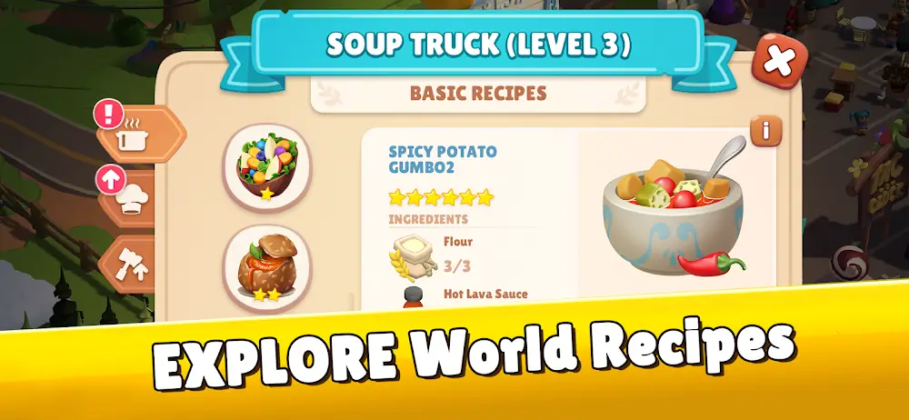 Adventure Chef Merge Explorer Mod Apk e challenge of matching objects to get the number of ingredients needed for the dish. By combining 3 pieces, you will create any item. It could be a jar of honey, chili pepper, or a piece of bread, and all are created and provided on the farm. The way to classify food sources by turning the area into many small areas on the farm will help you find it more accessible.COMPLETE REQUESTS FROM YOUR CUSTOMERSEach truck will prepare a different dish, customers in Adventure Chef will be waiting in front of the vehicle they want and name the dish they are looking for. In the allotted time, the player must gather enough ingredients for that dis