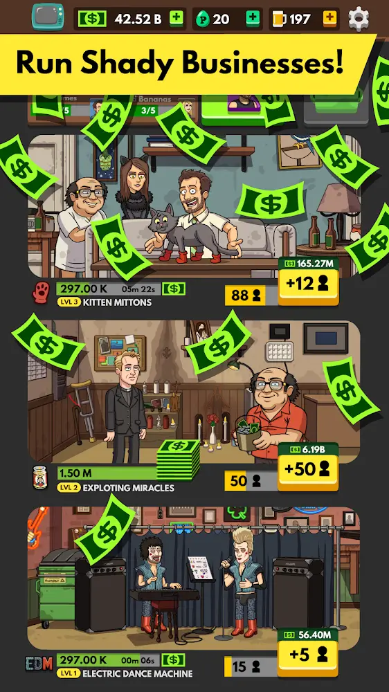 Always Sunny Gang Goes Mobile apk-en o build more impressive buildings. You also need to contact celebrities to perform for the bar to help your bar be more open. Players will also earn large amounts of money and invest in more branches than before.The bar you’re on is now thriving in this very Always Sunny. Players are also making investments to expand branches and combine with friends to open more activities. More interesting is that the source of money that you will earn will be a lot, and a part of you has made a sizeable real estate investment. It would help if you expanded many unique relationships in this game itself.