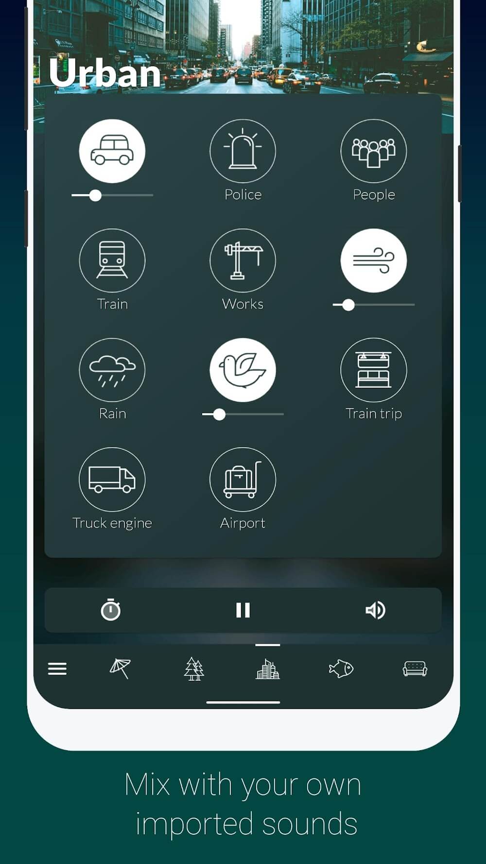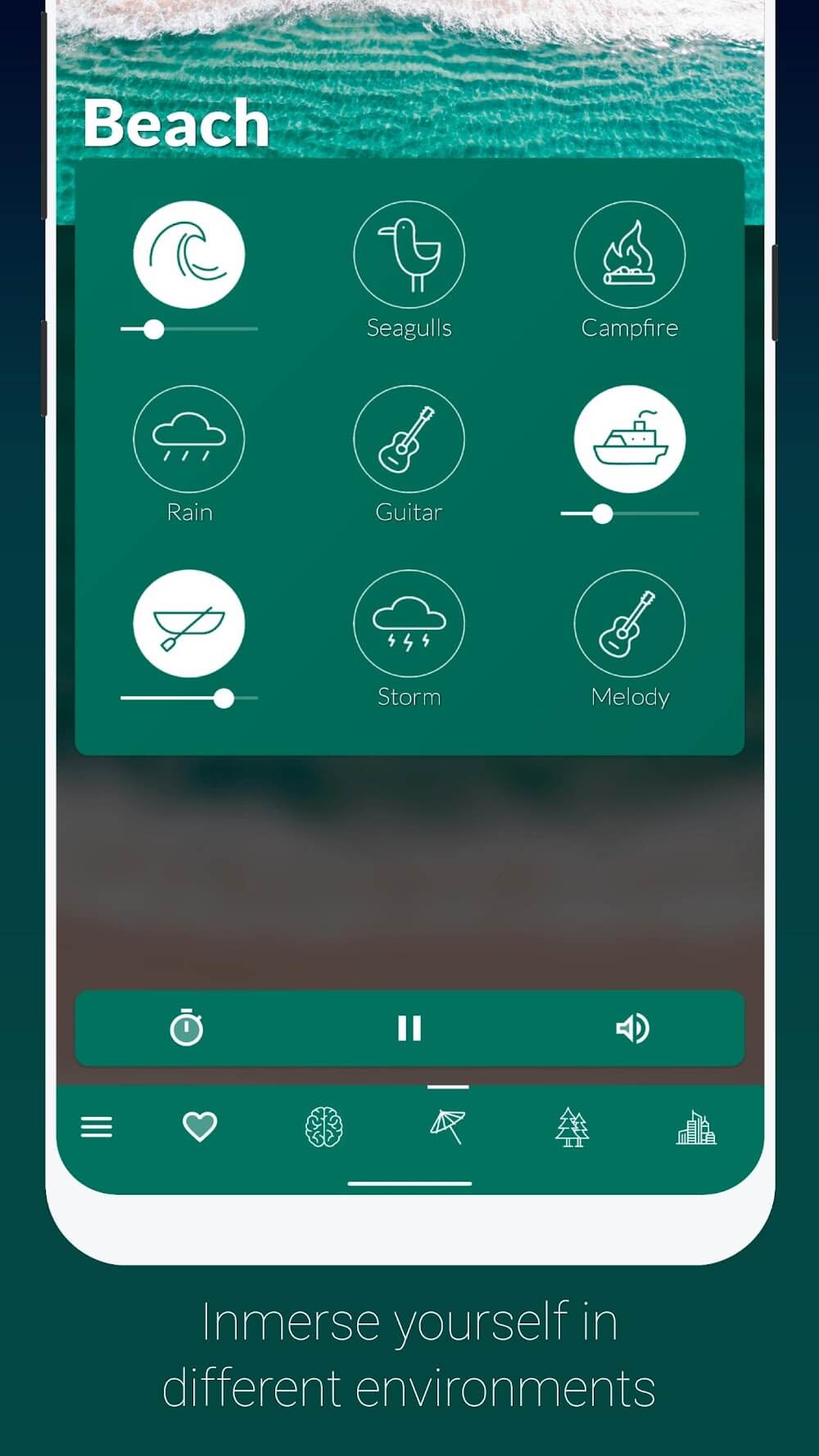 Atmosphere Relaxing Sounds Premium ditation sounds. This mode aims to help you relax and lay the groundwork for a restful night’s sleep by relieving the stress that keeps you awake.FEATURESRelaxing sounds: The app offers a variety of relaxing and soothing sounds divided into different environments such as Beach, Forest, City, Home, Underwater, Park, Countryside, East Asia, and Instrumental.Customizable sound combinations: Users can choose the sounds they like and create their favorite combinations to suit their needs, whether for sleep, meditation, yoga, stress relief, anxiety and insomnia, or just to enjoy nature.Binaural beats and isochronic tones: The app includes binaural beats and isochronic tones that can stimulate the mind, reduce stress, and stimulate creativity.Sound mixing: Users can import their own audios to mix with default sounds, and mix sounds between any environment to customize it as they want.