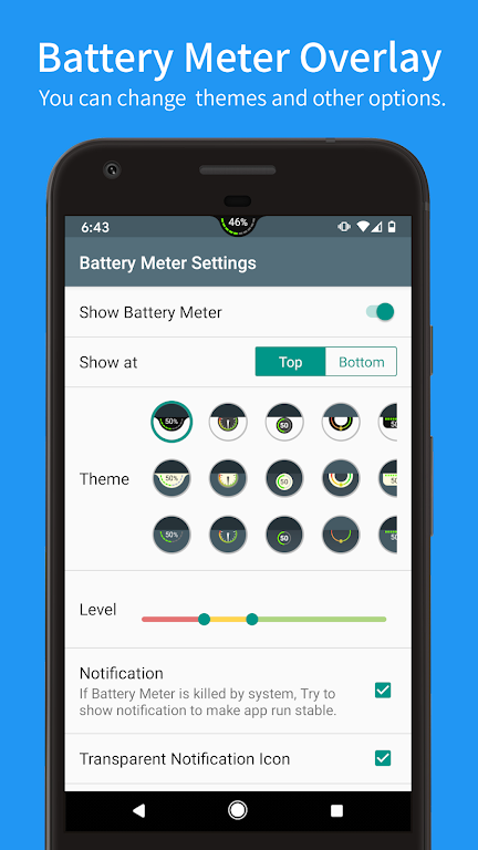 Battery Meter Overlay apk-en ase of the device. Specifically, it can temporarily disappear when you are using any element in full-screen mode.Adjustable Position: The position of the meter is often not fixed in a certain case. Therefore, you will be able to manually move them to locations without affecting the observation.Resizable Display: The size of the application can often scale according to a certain element of the device. This makes perfect sense since meter settings often have to accommodate the corresponding aesthetic factor.