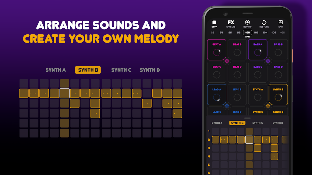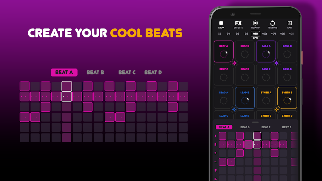 Create music and beats with ease using Beat Machine MOD APK – the ultimate music creation app.Users can create music using Beat Machine: Music Maker & DJ tools. Perfect compositions can be quickly created and shared widely. Each track features many instruments and unique chords. Users can refer to available sound packs for more ideas.INTUITIVE MUSIC CREATION TOOLSAdding interesting chords makes the music more special. Users can create many unique sound effects for their music. Drum beats create a vibrant effect for the music. Users can completely control the speed of the music.Easy Real-Time Effects: Users can control their entire music. The playlist