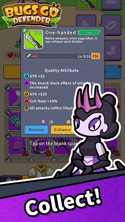 Bugs Go Defender Mod Apk insects. From the garden-variety ant to the formidable praying mantis, each foe requires a unique strategy to defeat. This isn’t just a battle; it’s an all-out war against the exoskeletal invaders. The satisfaction of clearing a map swarming with bugs is akin to the joy of popping bubble wrap – infinitely gratifying and slightly addictive.GEAR UP AND GUARD YOUR PETChoosing the right equipment in “Bugs Go: Defender” is like picking the perfect armor for a knightly quest – only shinier and with more bug guts. Players can customize their beetle knight with an array of gear that not only looks cool but also brings various tactical advantages. Your loyal pet isn’t just for show; it’s a battle companion that charges through the enemy lines with you. Thi