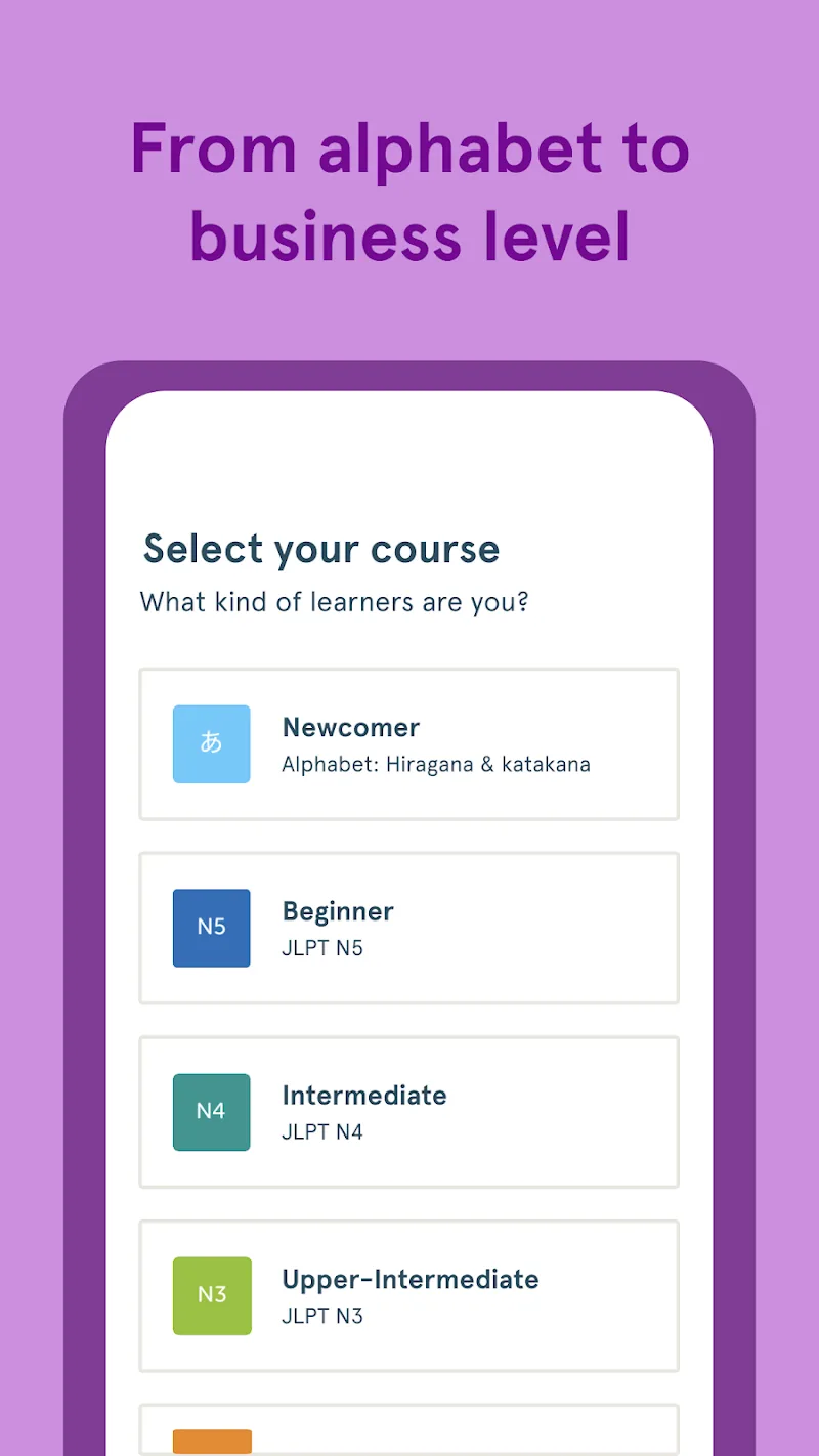All the lessons needed for Japanese language exams at all levels are fully provided in Bunpo: Learn Japanese. This application completes the sharing of Japanese grammar, vocabulary, and alphabet lessons so that users can self-study, self-review, and achieve the results they want.LEARN JAPANESE GRAMMARGrammar is a basic lesson when users approach a new language. The same goes for the Japanese. Users will learn many sentence patterns, from simple to advanced, to improve their ability to use Japanese. You can study more effectively according to pre-assigned levels and practice lessons.Example Sentences: Learning activities are more flexible and less boring when users learn specific sentence patterns instead of just approaching theory. The application shares more than 1700 example sentences to help users consolidate their understanding of grammar. You can get familiar with grammar from the provided sample sentences.Progressive Learning: The application’s learning programs are divided according to each level and the user’s language ability. The levels you can learn include all JLPT levels from N5 to N1. Users will have great private time to learn more progressively with this learning program.Thorough Practice: The application’s lectures will explain each part in detail to help users get familiar with the basic to advanced programs. Users can try their hand at exercises to practice grammar more thoroughly. You will gain more necessary grammar knowledge to be able to create a complete sentence yourself.OFFLINE LEARNINGThe application can be accessed normally even when the user is offline. This allows you to participate in learning programs anywhere without worrying about network connection problems. Users can also study on the go and take advantage of their free time.Anytime Access: Your learning will not be interrupted because the application still works normally without an internet connection. Users can access and complete their courses anytime and anywhere. The application can still launch all the learning programs and make people love learning Japanese.Offline Availability: The ability to access and study even when offline has greatly supported users in the learning process with the application. All lessons and tests are opened and taken without connection. Users can study at any time that is convenient for them.On-the-Go Learning: This application also provides a perfect learning service for studying on the go, no matter where you are. The learning programs are decentralized and taught in a modern way, allowing users to study anytime. You just need to spend time practicing, and you will be fluent in Japanese like a native.