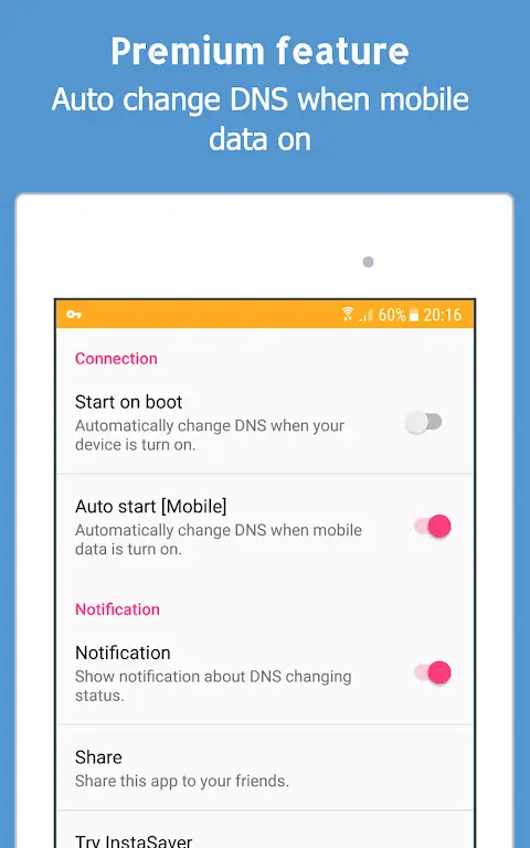 Change Dns Premium ft as a cheetah on steroids. Who knew we could turn internet browsing into an extreme sport?AUTO DNS CHANGE: YOUR DEVICE BOOTING UP WITH FRESH DNS SETTINGSThe auto-change DNS feature makes your life as easy as pie. Once your device boots up, Change DNS automatically changes your DNS settings, like your personal internet chauffeur. Now that’s service with a digital smile!ALWAYS ON THE MOVE? AUTO DNS CHANGE HAS GOT YOUR BACK!We live in a mobile-first world where constant connection is a must. So, why should changing DNS settings be any different? When you turn on mobile data, Change DNS automatically changes your DNS. It’s like your personal internet butler, always at your service!WHY DOES THE APP CREATE A VPN CONNECTION? IT’S LIKE A DISCREET BODYGUARDTo avoid the need for root permissions, the