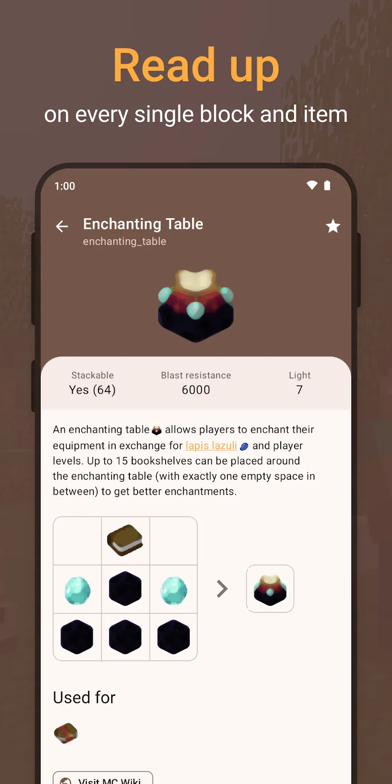 CleverBook for MC is an application that provides the most complete and detailed instructions for the famous survival game like Minecraft. CleverBook for MC will provide and allow quick access to the necessary information that players need to experience more easily, including information about each block, item, creature, environment, spell, potion, redstone circuit, command, and many other important contents. CleverBook for MC is the ideal companion to help you easily survive in your own world or when playing with friends on multiplayer servers.One of the outstanding features of CleverBoo