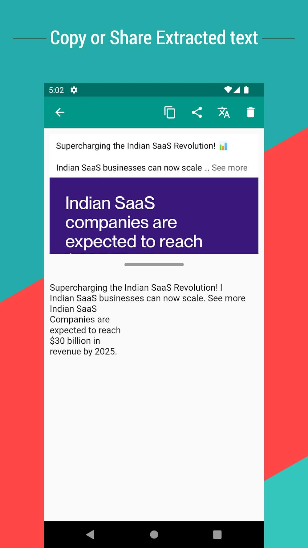 Copy Text On Screen pro provides a service to extract text from images displayed on the screen. The user will upload an image containing the text and select scan to execute the command. A photo uploaded from the gallery, taken directly, or shareable from other sources. During the launch, the application regularly upgraded and added many new f