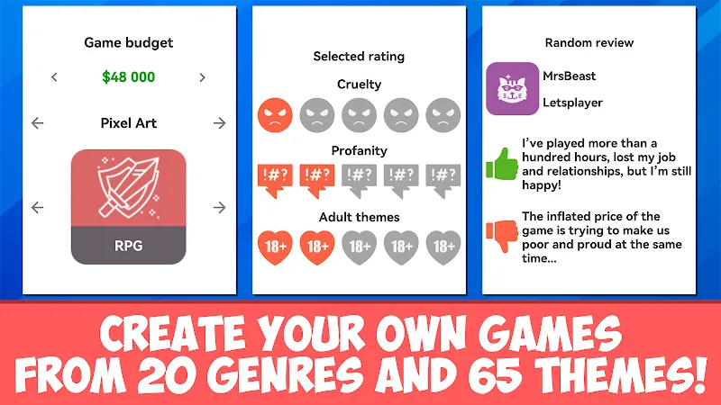 Dev Life Simulator Mod Apk es and more. The graphics styles are varied and you get to pick a game engine that matches your vision. You can make games for adults only by adjusting rating settings like profanity, adult content and violence. Top it off with voice actors and motion capture for ultra realism.BUSINESS EMPIRE BUILDINGDev Life Simulator lets you build an entire business empire around your games. You can buy different companies like gaming sites, digital publishers and even corporations. Expand through several stages and manage a studio with over 1800 unique employees. Invest in promising projects and watch you