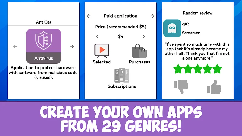 Dev Life Simulator Premium r empire grow.APPLICATION DEVELOPMENTIn addition to games, you can also create your own applications in 29 different areas. Make antiviruses, streaming platforms – anything you can think of! Set pricing, choose sales regions from Latin America to Asia, pick monetization models and localize as needed.HARDWARE MANUFACTURINGTo run your games and apps, produce your own hardware like smartphones and consoles. Customize shapes, colors and components to bring your wildest tech dreams to life.LIFE SIMULATIONDev Life Simulator features deep life simulation systems. As your character ages, they can s