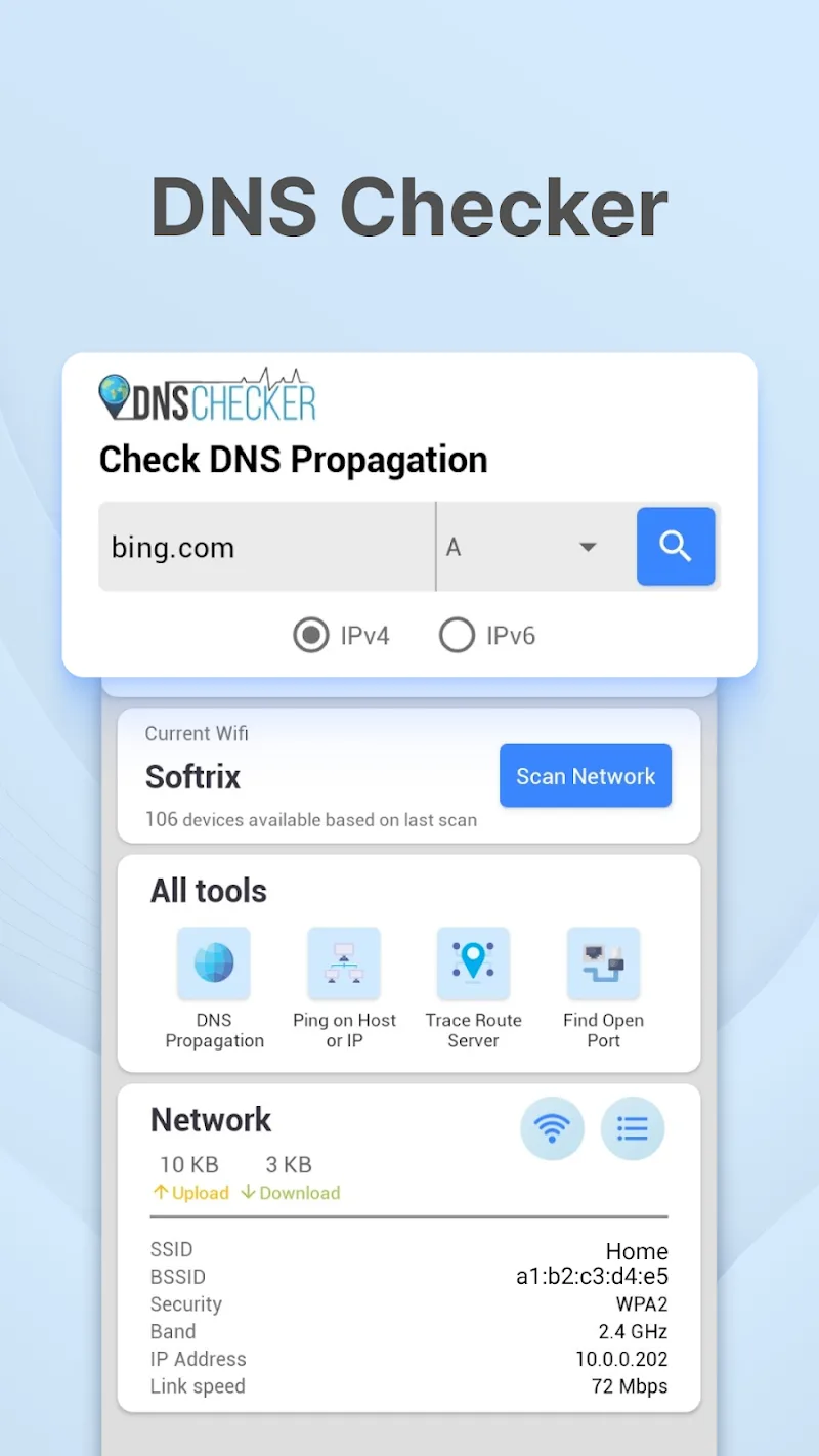Dns Checker Network Tools apk-en configured and prepared to use. In this manner, clients will be able to utilize these progressed comparison devices to highlight irregularities in records on the server with total comfort.Oversee All Records: The framework will give clients a single interface to handle A, AAAA, CNAME, MX, NS, and TXT records.Spare Valuable Time: Clients will have a streamlined confirmation process that saves time and reduces errors.Compare With Ease: The application possesses progressed comparison devices that highlight irregularities in records on the servers.