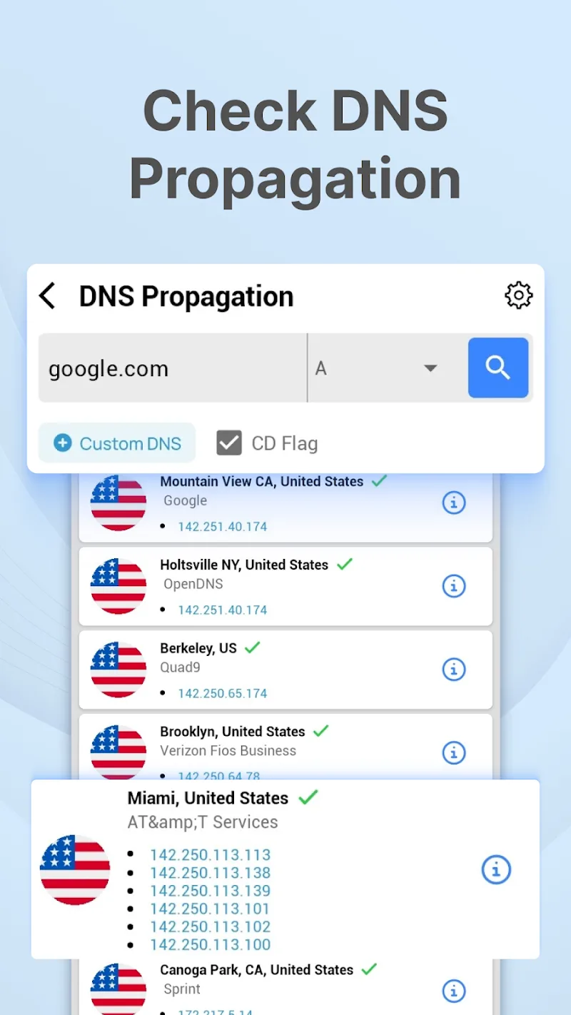 DNS Checker – Network Tools is an application designed to provide useful experiences that users can change the way they use their technology devices. The application will provide users with the ability to check the DNS propagation process worldwide through specially provided optimization network tools. Users will be able to perform tasks such as global DNS propagation check, route tracking, network scanner, and much more with this application.WORLDWIDE DNS PROLIFERATION OBSERVINGOne of the alluring highlights that the application can bring to