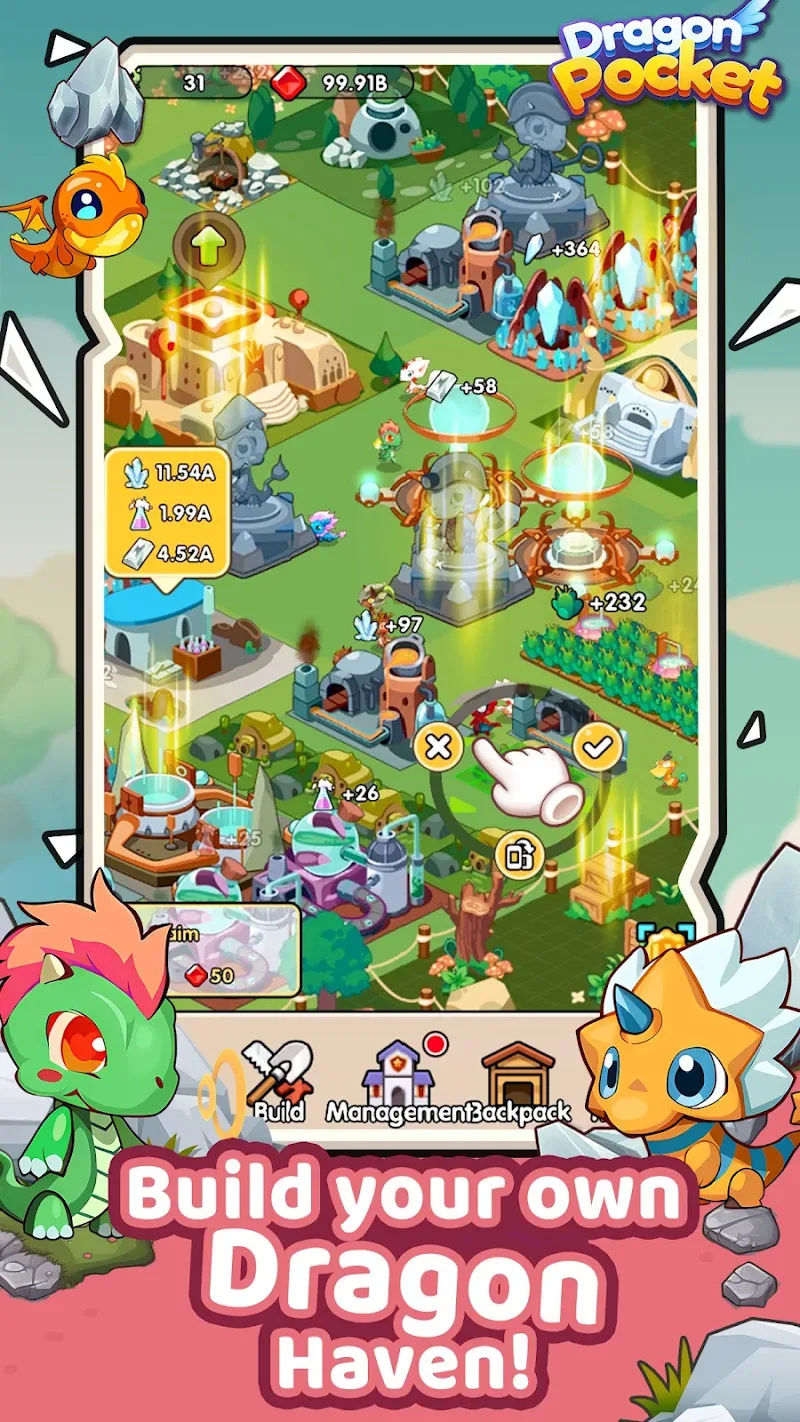 Dragon Pocket tells the story of the world of dragons, where no other creatures exist. Everything exists to serve the dragons. You will play the role of the owner of a farm. There, many species of dragons are allowed to exist together. They will serve the player’s fighting purpose. Above all, you will build yourself a powerful force. In addition, there will also be many forces that are gradually growing beside you. Competition is the most powerful medicine that makes you develop. This game is both a farm game and a