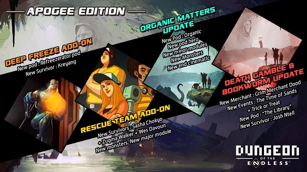 Dungeon Of The Endless Apogee Premium ncing the dynamics between ex-inmates and guards. Equip them, deploy them, and unlock powerful abilities. Remember, a well-coordinated team can be the difference between life and a monster’s lunch.DEFEND, BUILD, REPEATDefense is the name of the game. Players use Dust to power rooms and scarce resources to keep their team alive. From building minor to major modules to fend off monster waves, to decoding the secrets of Endless ruins for life-saving tech, strategic defense is crucial. And if you’re wondering where to get all these resources, just remember: every door you open is a potential treasure trove… or a death trap.THE THRILL OF EXPLORATIONOpening each door in Dungeon of the Endless: Apogee is like unwrapping a mystery gift. Behind each door lies danger, so players must