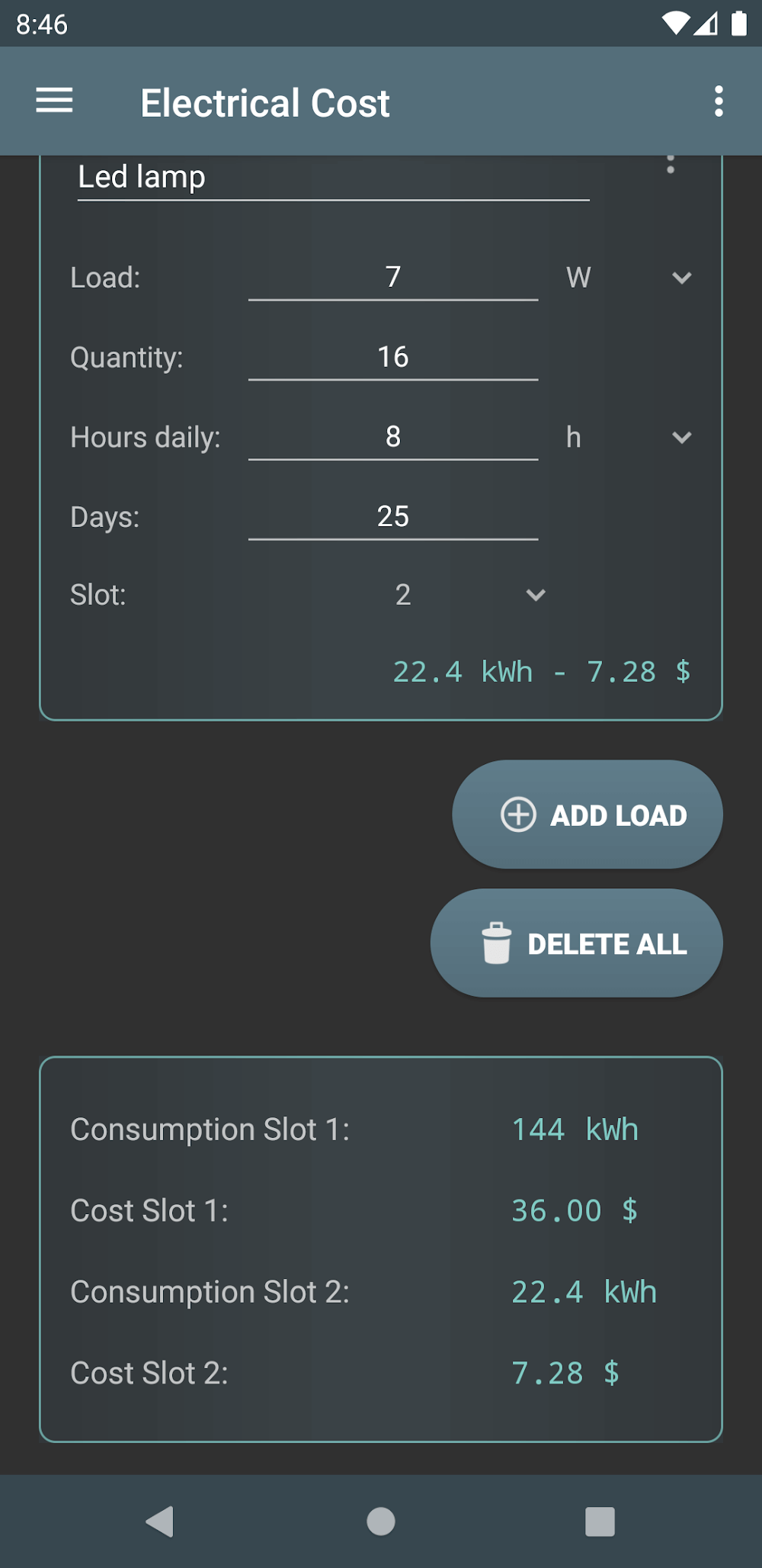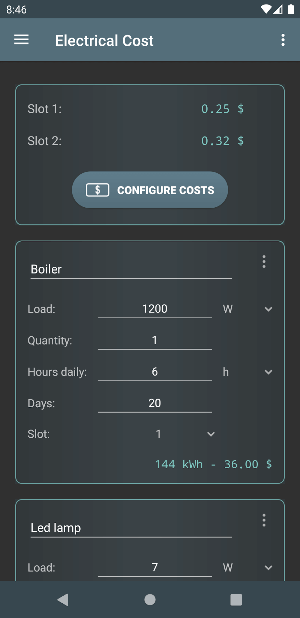 Electrical Cost 2 apk-en .SEARCH FOR PREDEFINED ITEMS AND LOADSThe amount of electricity that is consumed, along with the associated costs on a daily, weekly, monthly, and annual basis, are well-calculated by this app. Thus, it will show you different predefined loads for certain items, such as lights, devices, machines, and more, so you don’t have to put in the values. However, those loads are based on the basic and average items used widely, so it’s helpful if they match some of your items.