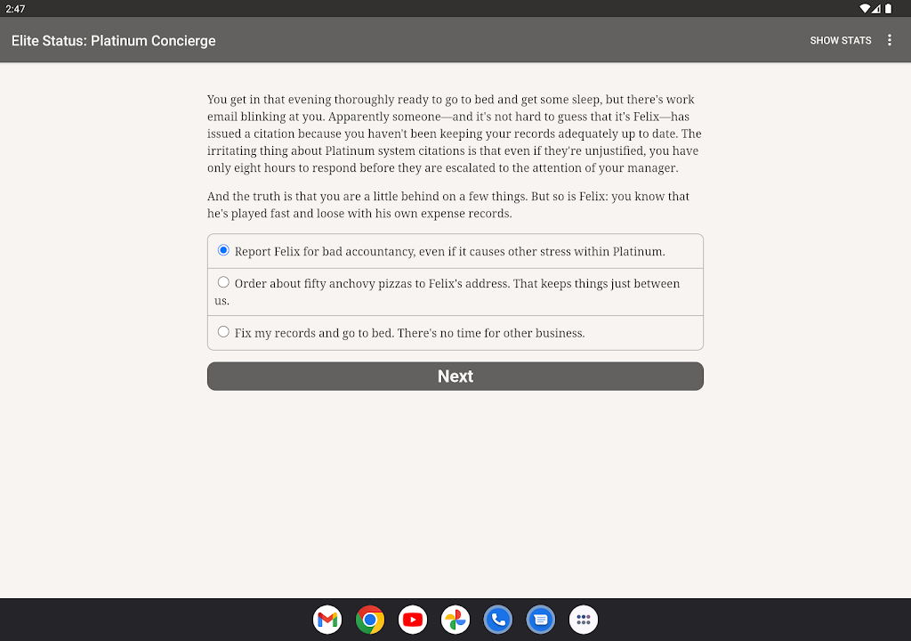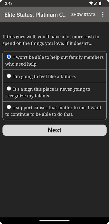 Elite Status Mod Apk y cannot ignore. At the same time, the number of choices often brings unexpected directions of development.Vast Narrative Scope: The game has a storyline conveyed through 500,000 words. Therefore, all your decisions lead to a new storyline branch with many unique events.Moral Dilemmas: During the exploration process, each person will often spend time learning about events. This is the basis for you to aim for each choice and shape the storyline.Immersive Roleplay: Each
