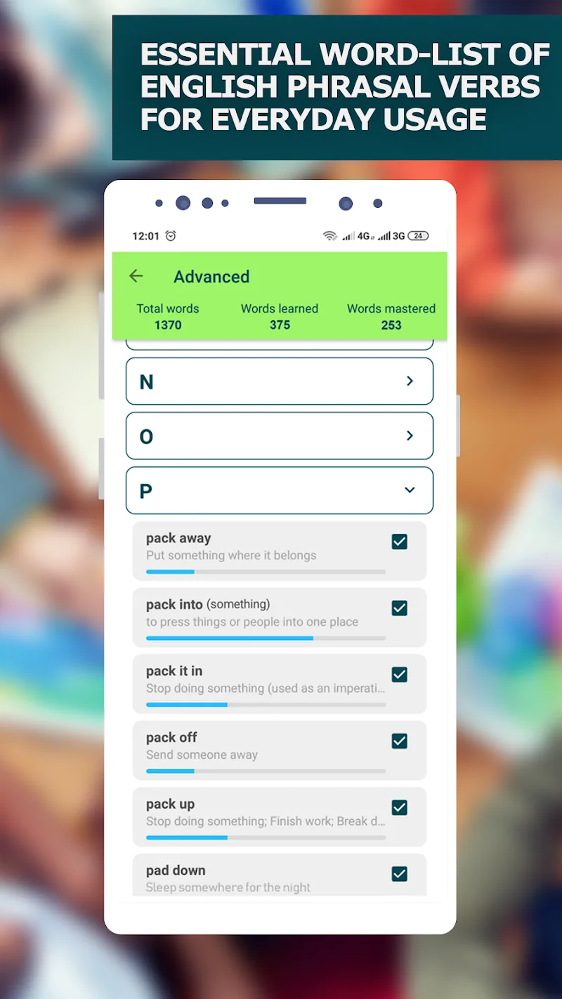 English Phrasal Verbs Phrasal Verbs Premium knowledge of the lesson is recorded in the cards. These special flashcards will help users learn phrasal verbs more easily. Some phrasal verbs will be explained in detail so that users can quickly understand and use them.EFFECTIVE MEMORIZATION SYSTEMThe application establishes a solid knowledge system related to phrasal verbs. Users can learn according to the method guided by the application. They can also interact with the flashcards designed specifically for the application. After completing the lesson, users can also take a knowledge consolidation test.Uses Spaced Repetition: The application also introduces many effective learnin