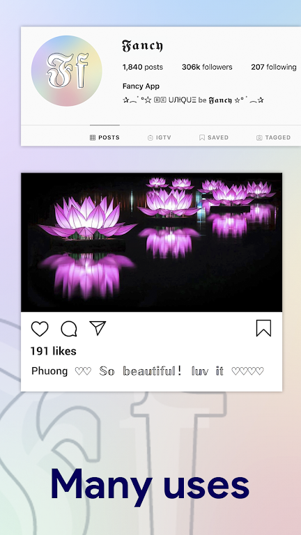 Fancy Fonts Premium detail to help you know what suits your needs. It is a long list and attracts users because of its diversity and application. Comes with fonts, usually special characters, and simple character expressions. You can create any information stream from keywords and feed it to the application to process it into a series of elements.UNLOCKING INTERESTING USAGE POTENTIALAny feature of Fancy Fonts is applied across different platforms. For example, users can create a special character