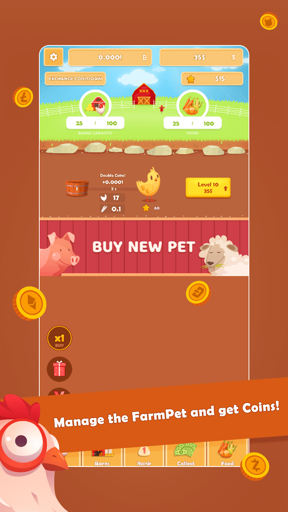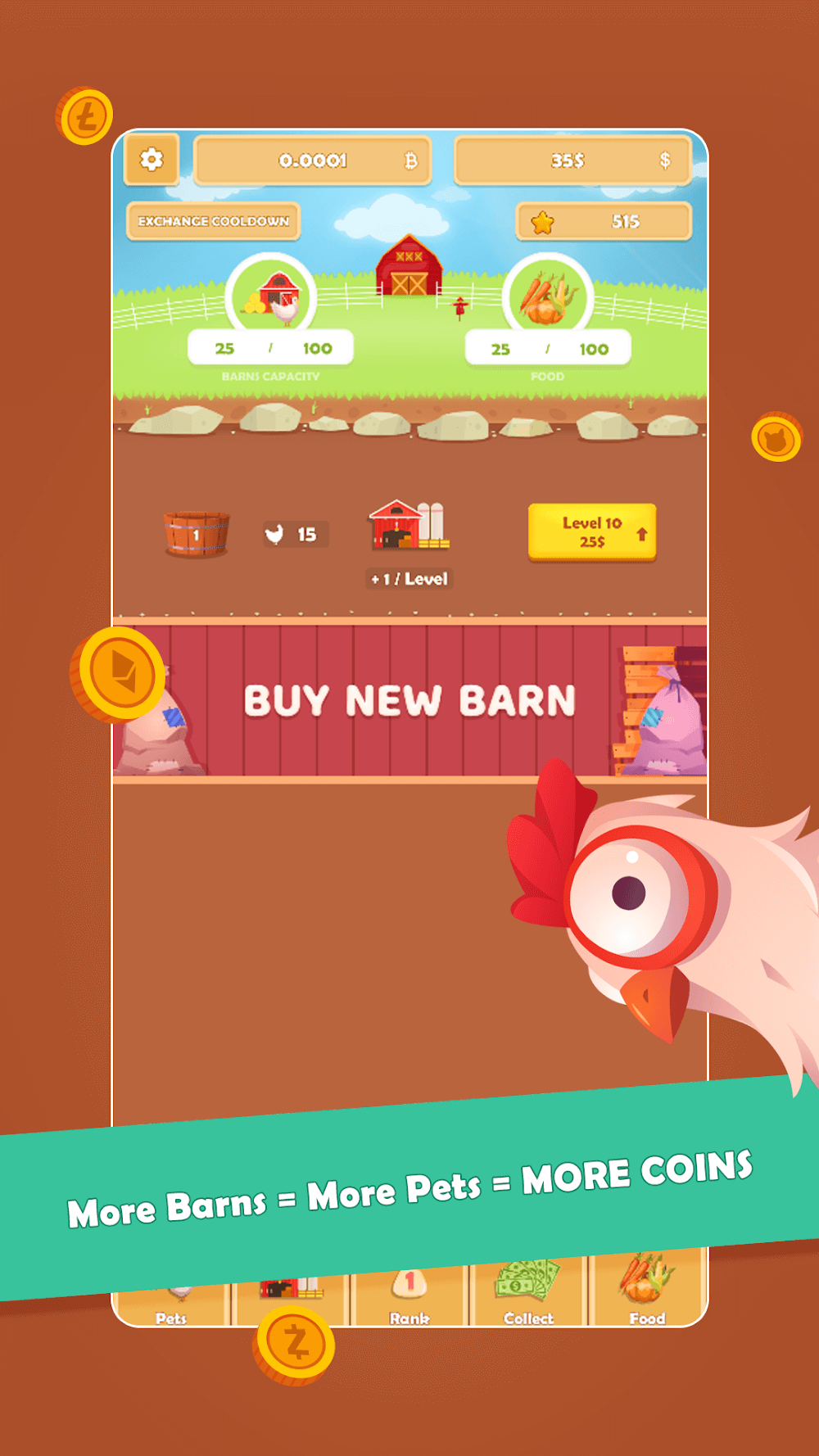 Farm Pet Idle Crypto Mod Apk er achievements. You can renovate the barn to welcome new members. The barn and farm upgrade will require a lot of coins to perform.The game will give out free cages and pets on event occasions. If you want new animals, you’ll have to unlock them and buy them from the shop. Players can experience Farm Pet Idle Crypto to gain experience in raising and taking care of pets. Besides, you can generate income from this task. The farm will be a great virtual currency mining machine that you