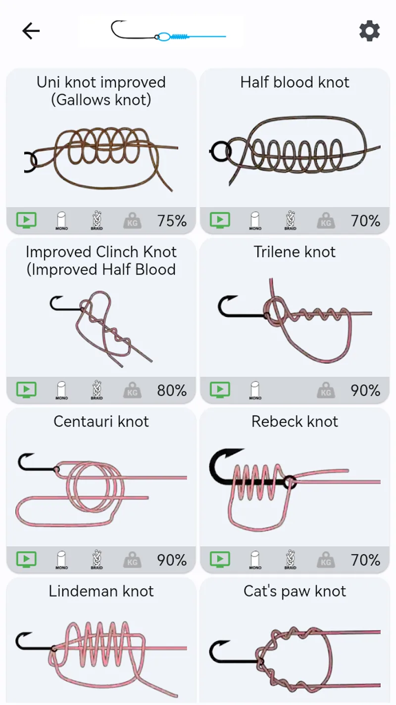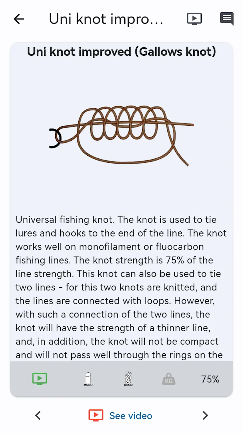 Fishing Knots Mod Apk guide those who have just done it and it is not too difficult for you to use these knots. If it is too difficult, you can also watch videos instructed by experts.Step-by-Step Guide: The application provides specific illustrations of each step to help users easily create the knots that they are making.Strength Assessment: Each knot will have additional estimates of the strength loss so that users know how to tie it most accurately. Depending on the implementation method, users can determine the purpose of serving special cases.Line Reco