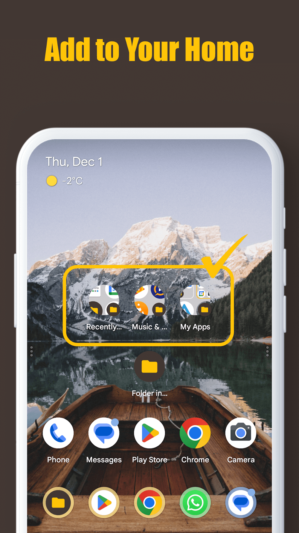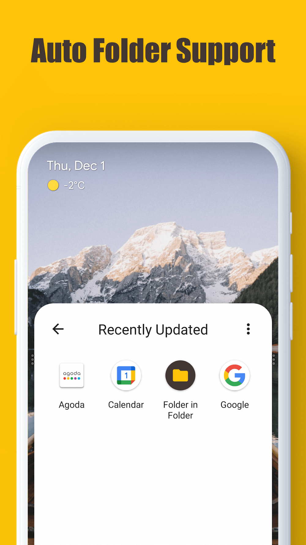 Folder In Folder Premium Auto Folder, you may still make your folders to refine your app management further. A perfect combination of the two!EASY INSTALLATION OF FOLDERS IN YOUR HOUSEFolder in Folder makes adding neatly arranged folders to your home screen easy. Select the folders you want to add, and they will display on the home screen for simple access; no more delving through menus or searching for hidden options. The app works in tandem with your device’s home screen, making it easy to access your various folders. Folder in Folder allows you to customize your home screen, whether a bare-bones layout or a plethora of frequently-used apps.MODIFIABLE LAYOUTS LET YOU PUT YOUR STAMP ON THE APP EXPERIENCE.Folder in Folder not only provides excellent organizing tools but also allows you to personalize your app organization experience through the use of themes. You can customize the appearance of your