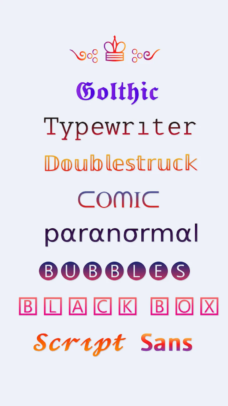 Fonts – Fancy Fonts Art provides you with a variety of fonts to change the look of your text. The application gives you a lot of choices, and each font has a special feature that you may not know. Many different styles and constantly updated new font samples will help you in your usage process.WIDE RANGE OF FANCY FONT ARTThe application gives you suggestions according to your wishes, and these fonts are fully provided. You can state the purpose of using the text, and the application imme