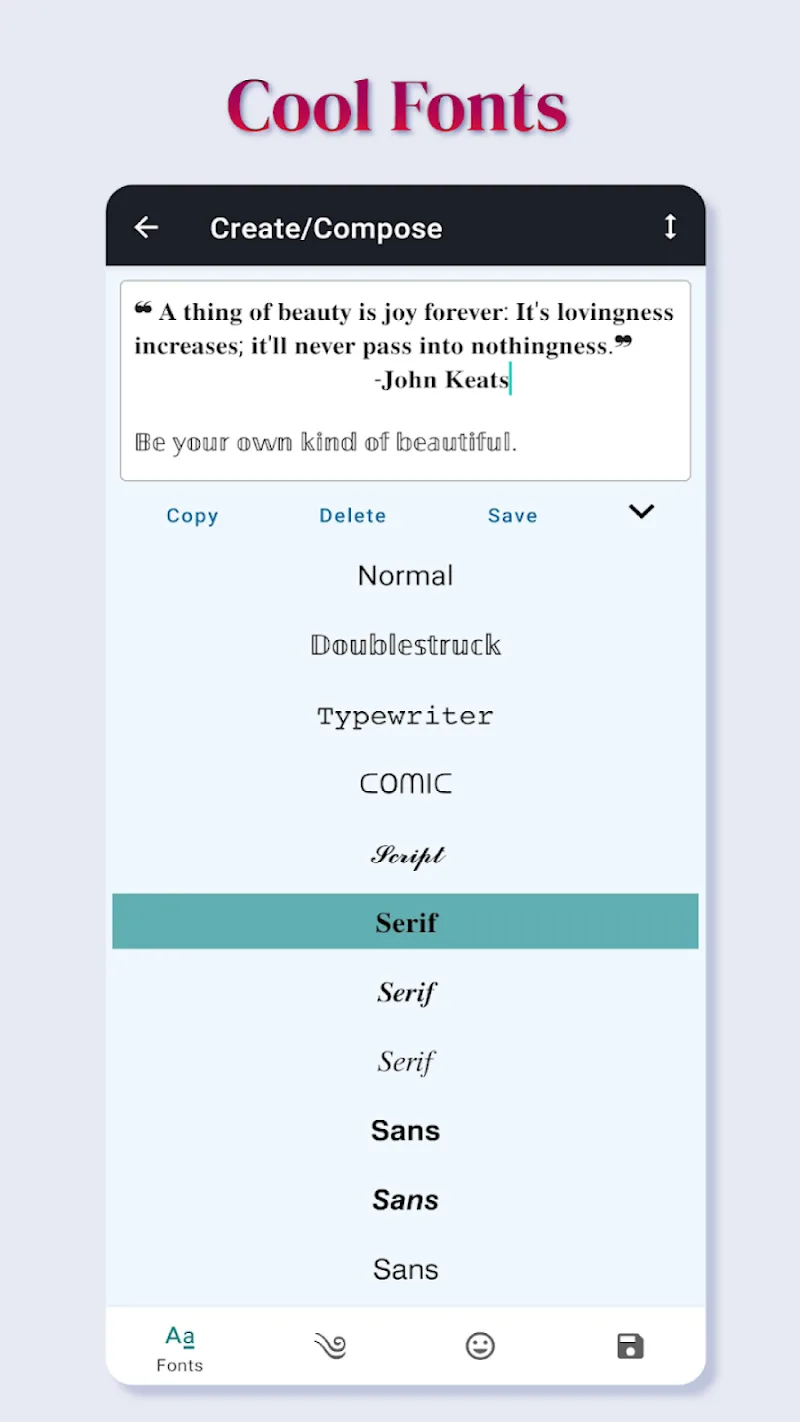 Fonts Fancy Fonts Art apk-en s than manual fonts.Quick font switch: Hundreds of different fonts, each with a name. You can switch flexibly and easily from one font to another with just a simple touch.Easy-to-use interface: With a friendly interface characterized by each style, users can easily use or regulate to change the features according to their personal wishes.Versatile for messages: Convert even regular text messages into more artistic, characteristic, and professional thanks to the support of many special fonts.