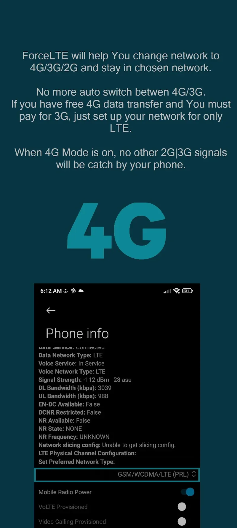 Force Lte Only 4g 5g Mod Apk ete control of their own mobile data network on the device. The application will prevent automatic switching between different personal mobile data network configurations, such as 4G/3G/2G, but instead depends on the user’s choice. Users will be able to control how their device can use the network to ensure the stability of data to perform work smoothly.Stop automatic switching: The application will stop automatically switching between 4G/3G/2G networks and maintain a stable connection.Lock preferred network: The system locks your preferred network and