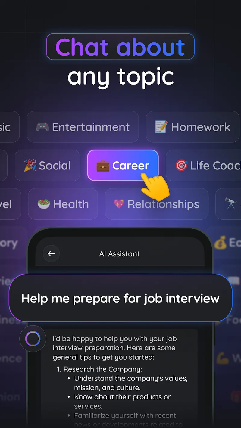 Gemmy Ai Chat Assistant apk-en ations. Through these sample commands, the application’s artificial intelligence system can understand the user’s needs more thoroughly and carefully and give the most accurate response to the desired.Templates For Success: The application is prepared with ready-to-use templates to save time and inspire creativity.Professional Writing Guide: The system has perfectly structured suggestions for any writing task.Creativity Made Easy: Users will eliminate writer’s block with suggestions created by experts.