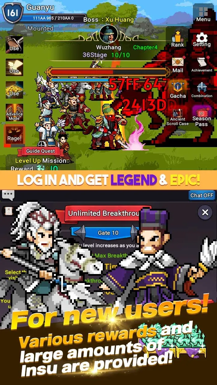 Guanyu Idle Mod Apk Guan Yu to better understand what he has been through. The journey of fighting and collecting helps enhance your connection with history. Each match is like retelling ancient stories more uniquely.Convenient Offline Progress: Each member is engaged in easy gameplay that allows progression even when they are offline. Classic battles are the perfect choice for busy players. You can play anywhere and anytime you want.Charming Dot Design: Players enjoy the charming 2D dot character design. Each character’s ability will be shown through the game’s character design. You will be overwhelmed by the smoothness of the game’s
