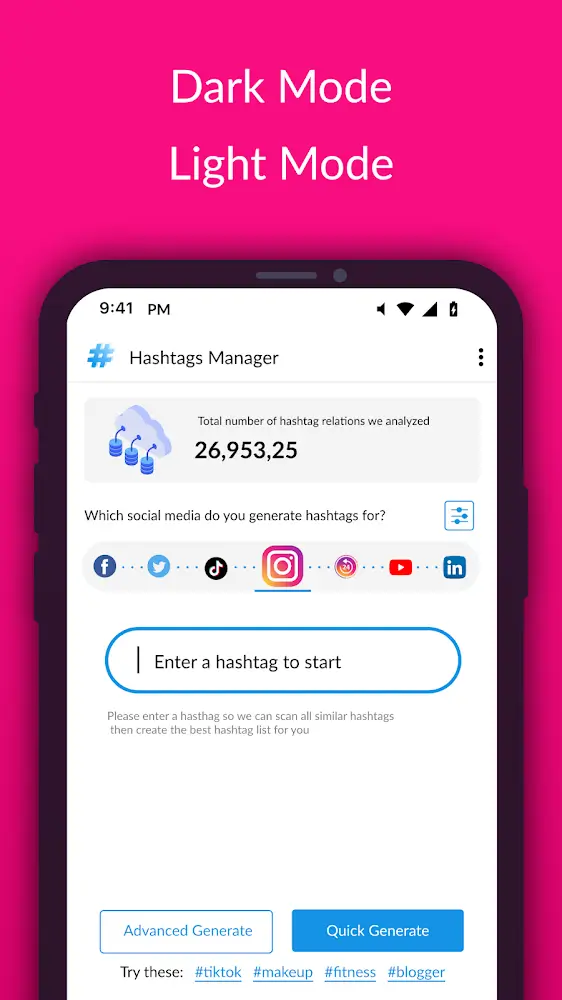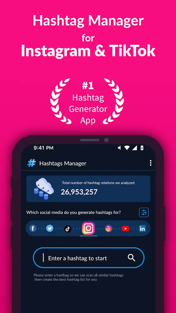 Hashtags Manager For Followers Premium that are becoming trending at the top of the message board for users to capture and choose. Your life will be more enjoyable with this incredible support.CONNECT WITH MULTIPLE SOCIAL MEDIA ACCOUNTSA variety of social networking platforms will be connected to Hashtags Manager to make the process of suggesting and using your pound sign simpler. With the most popular source of connections on Instagram and TikTok, users who own accounts on these two social networks have the most opportunities to become famous. Besides, about 7 other platforms are also supported to fill quickly in the pound sign requested by the user. Your journey to make a perso