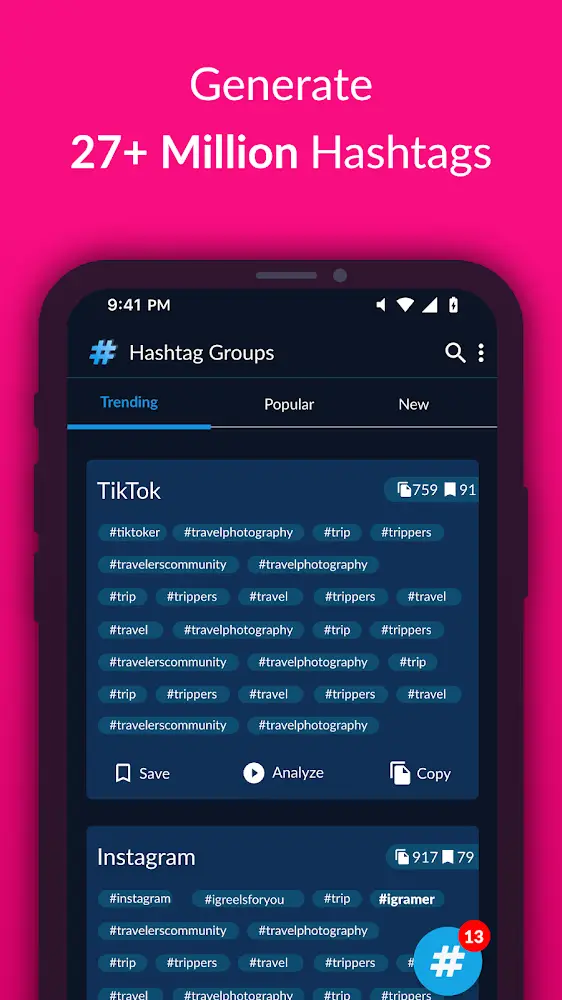 Hashtags Manager For Followers apk-en nal mark, follow social trends, and improve your popularity will be with us. Users are ready to get more likes and followers after posts that use the suggested pound signs.IMPROVE YOUR POPULARITYHashtags Manager will develop an extremely favorable environment for users to become one of the prominent people on social networks. You are free to do your creation and use the pound sign. In addition, we assist users in tracking the popularity of the pound sign to apply in subsequent posts. Your chances of becoming famous in the community will increase when you use the trend sign. New followers and recent favorites bring you closer to the community.