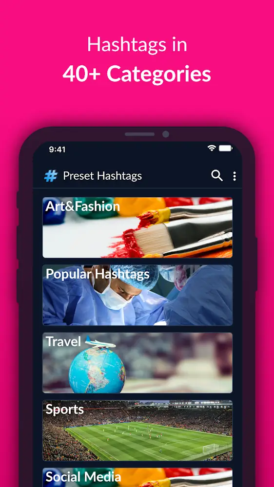 Hashtags Manager For Followers Mod Apk sts with higher likes when using a prominent pound sign. In addition, we allow users to review your articles that have used the pound sign and can aggregate their usage. Anyone can become a trendsetter with the outstanding content they build.CATCH SOCIAL TRENDS WITH THE SEARCH BARThe search elements appear in the Hashtags Manager to assist users in quickly searching for any hashtags. They will be found with the most relevant results and show the ones with the most interest at the top. Users can view articles with content related to that pound sign and enjoy the amount of information that will be gathered. The system also displays the hashtags