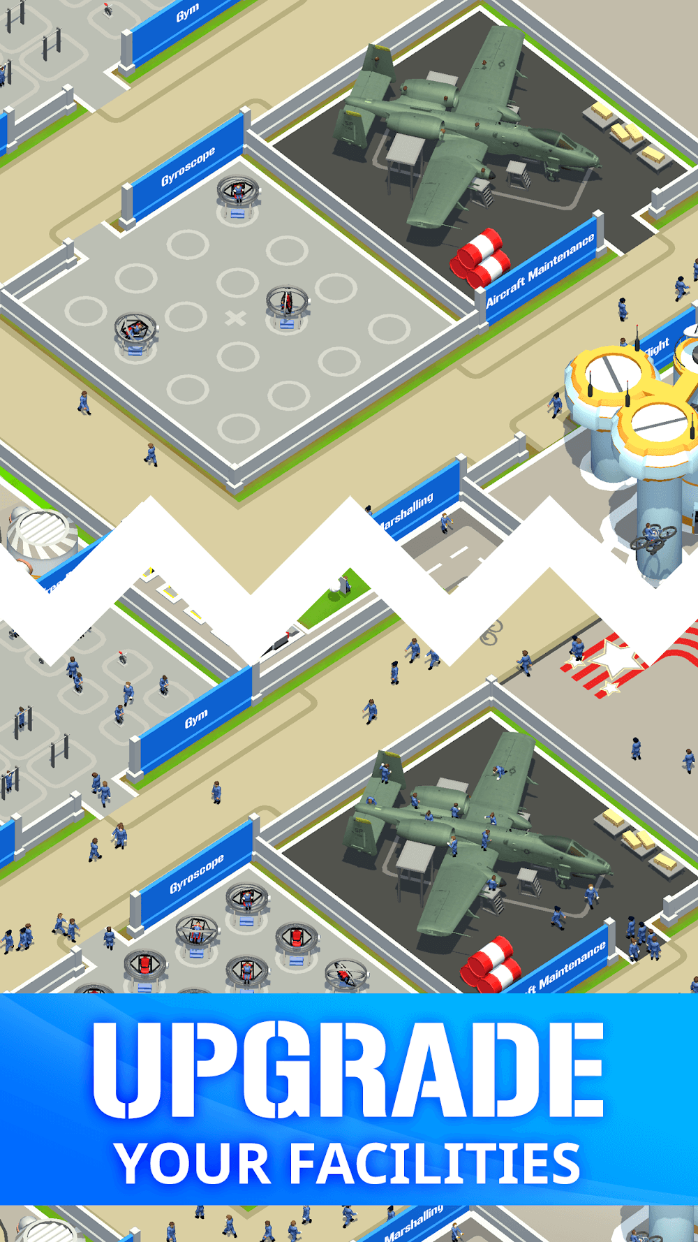 Idle Air Force Base apk-en tuck in the sea so train the force in Water Survival training centers.Apart from all these training centers, the central and vital training for the battle is Pistol Range training which gives the team basic training to use firearms. And another important thing for the Idle Air Force team is fitness maintenance, so buy a Gym to train the fitness exercises for the team. You should purchase many other training centers in the Air Force Base to train your team and win the battles worldwide and conquer them.