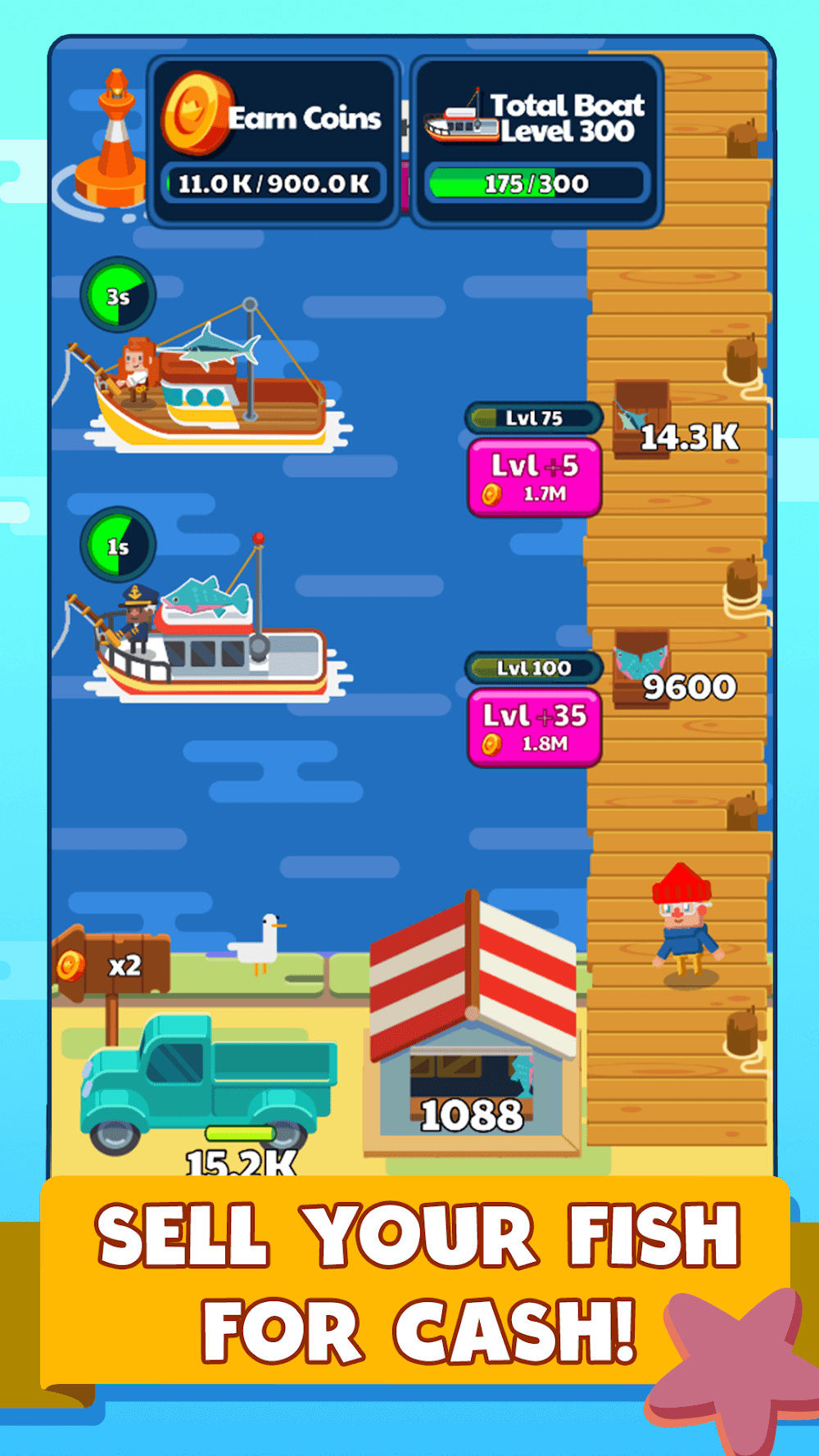 Idle Fishing Story Premium argets set by the game to continue progressing. Each fishing mission takes time to complete. Players can shorten the time by working harder.RECRUIT POWERFUL CAPTAINSPlayers recruit new characters to work for them. When players are absent, fishing boats will still go to sea. The captain designated by players will replace them to command the fleet. Each business can own many fishing teams.Offline Profit Boost: Fishing boats can go out to sea and catch fish even when the player is not present. The captain will do the job for them. The crew will receive the captain’s command. The captain decid