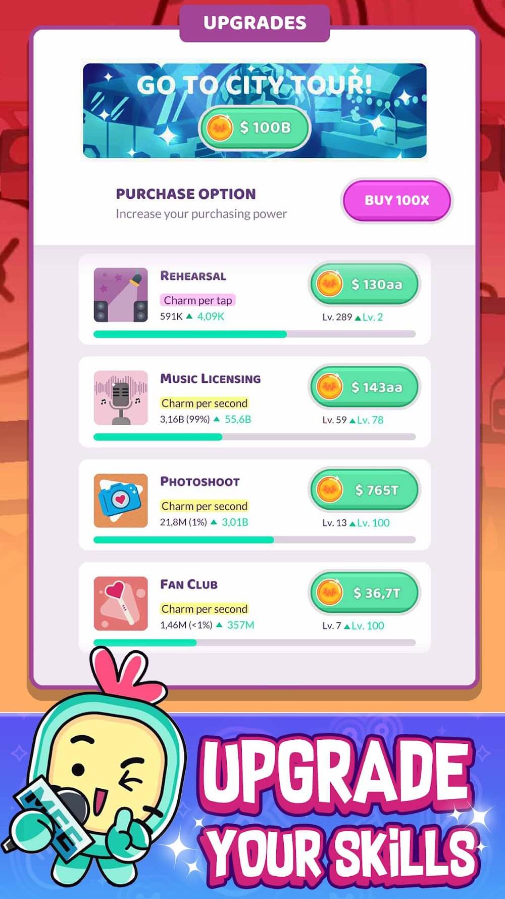 Idle Idol apk-en s all over the place to make the most money. When rookie teams arrive to compete, you’ll be in big trouble. At this point, the player must decide on a new performance style and purchase additional accessories. You can hire audiences and run advertisements to entice more people to join. Unlock new rounds at any time, even if you don’t open the app, thanks to the pre-set autoplay mode. Immediately start a battle with your friends and try out many newly released songs.