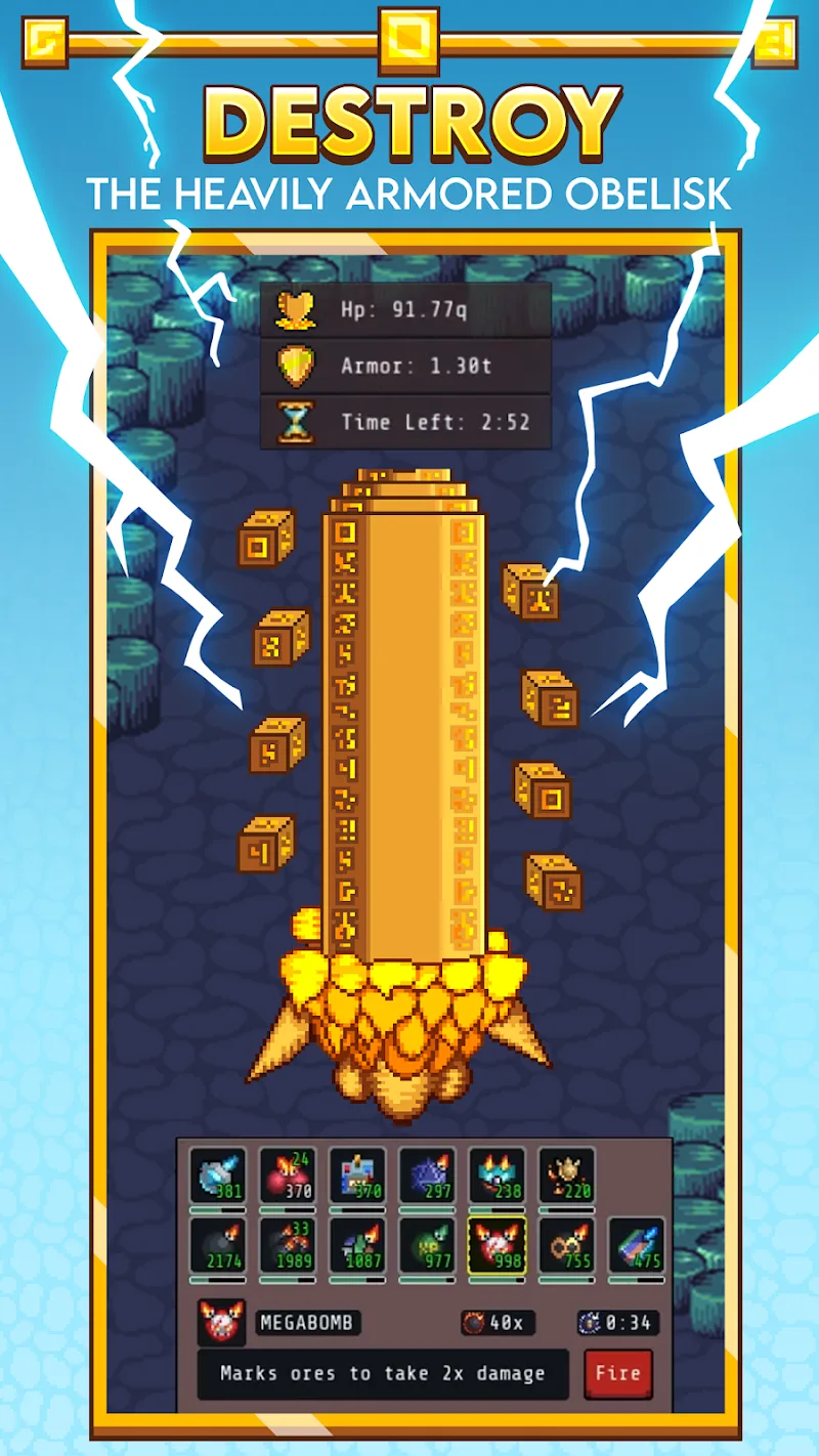 Idle Obelisk Miner Premium Play: Bombs and drones let you walk and progress idle while accumulating resources and stats.Playstyle: The game includes engaging active and passive idle play.Offline Progression: Even when not actively playing, the offline progression mechanism will reward you and help you move forward simply by leaving the app open.DEFEATING THE OBELISKBut it cannot be said that Idle Obelisk Miner is a boring game built on an idle system when the challenge is intense. The main goal that any player needs to aim for is to defeat the monuments that the game prepar