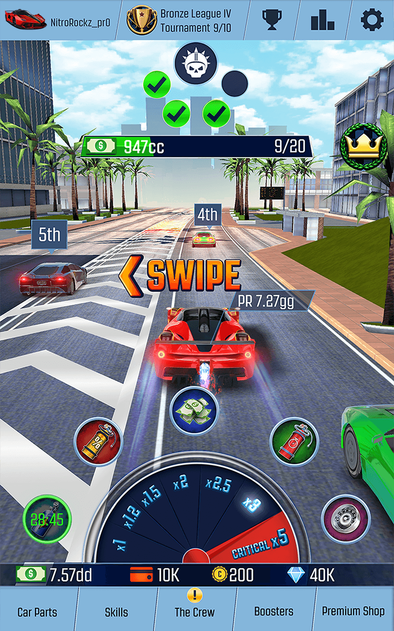 Idle Racing Go Clicker Tycoon apk-en with the Boss car. To make more money and boosters, complete achievements like reaching 1k performance, earning 2k cash, beating 100 opponents, completing Bronze League 5, tapping 200 times, etc. And also you can assemble sets with boosters. If you want more blueprints, swipe five times. Unlock more levels and get skills like Super Fuel for high performance, Automatic Ride for auto taps, Hazardous Nitro for critical Nitro chance, etc. To experience all these fun challenges, play Idle Racing GO: Clicker Tycoon and show your racing spirit.