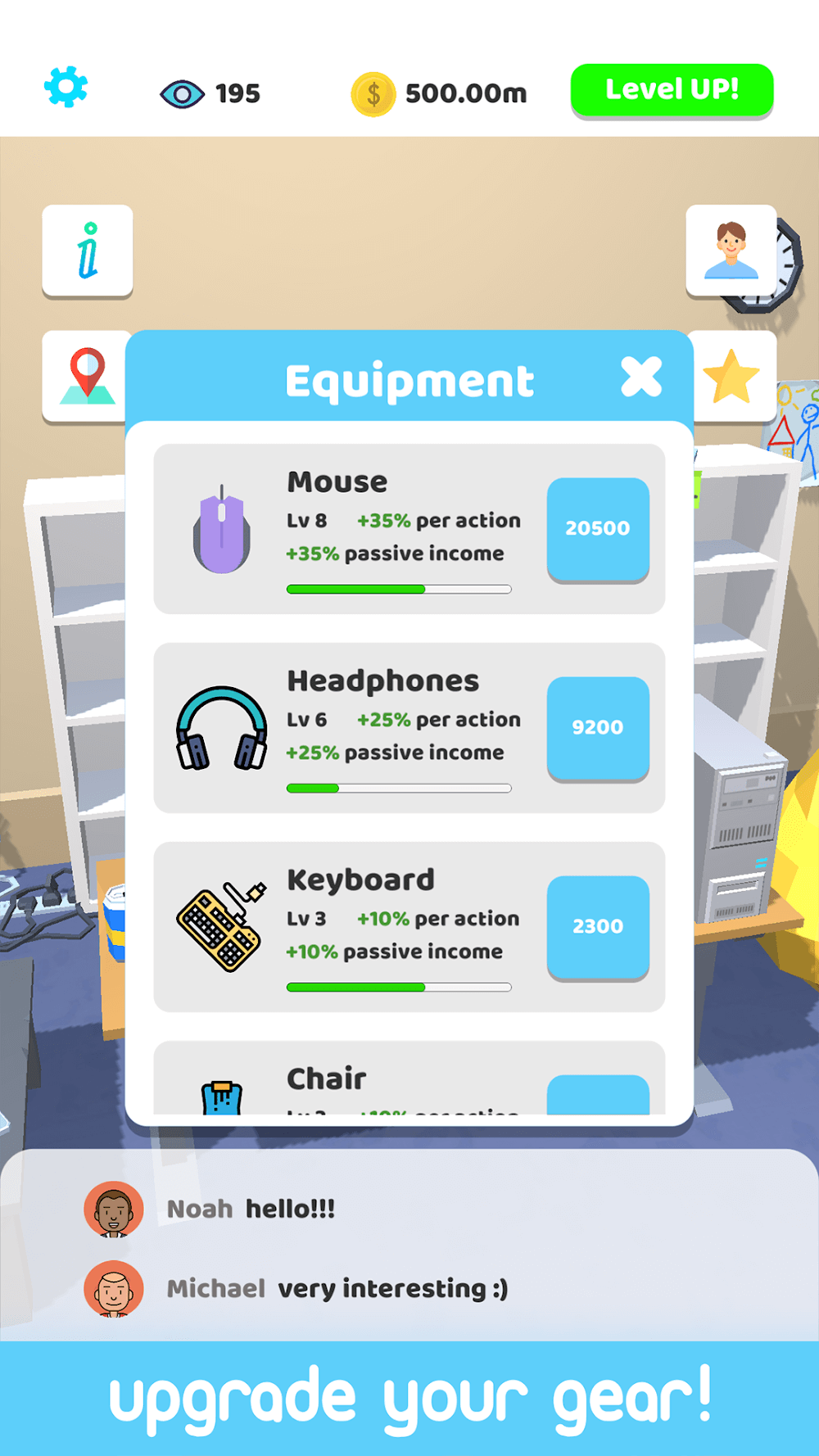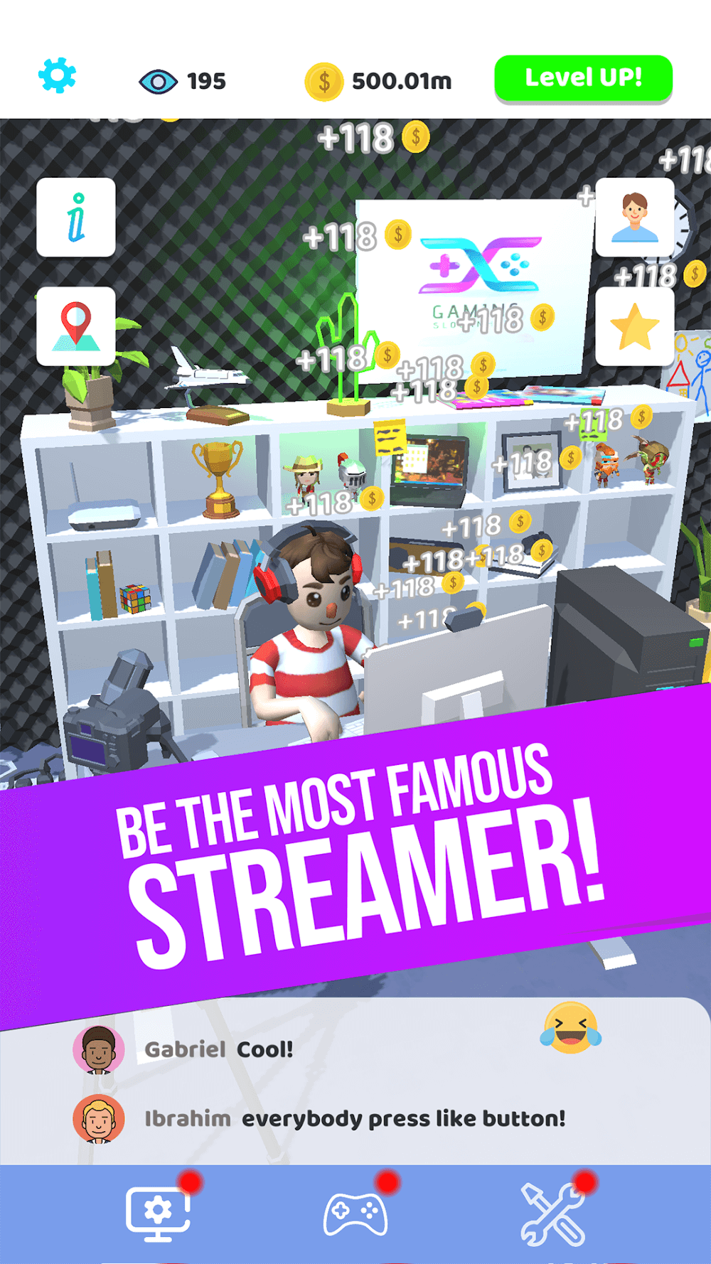 Idle Streamer Premium s you attract, the more money you will earn; in the future, you can quickly become a millionaire. To build your name and career in the streaming industry, you need a lot of fans, so always bring creative and exciting content.EQUIPMENT UPGRADETo succeed as a streamer in Idle Streamer! Then you have to invest in your stream room with some essential equipm