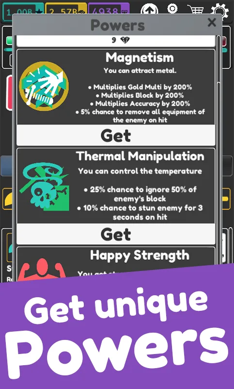 Idle Superpowers Premium will provide combined powers to form unexpected and powerful combinations, leading to devastating and creative combat strategies.Fresh Gaming Experience: Players will experience a new experience with each playthrough with the ability to create random powers, turning each session into a unique adventure.PROCEDURAL CONTENTIn addition to the optimal power source that the game can develop, players will also have access to a system of many different challenges to fight. But players don’t really need to worry too much about this because the game is designed in a