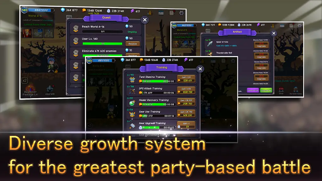 Idle Tank Dps And Healer Premium reward and accumulated resources to motivate players play long time without being required to stay online.Strategic Power Options: The game has a power-up option to strategically form a lineup. Players should employ skills and powers that are suitable for the character in order to maximize his/her teammates’ performance.GLOBAL COMPETITIVE CONTENTPlayers can compete against each other in PvP matches and 3v3 modes. Ranking system is divided into Combat Power, World Stage and DMG for players to have some friendly competition. Players can also team up with their friends to take dow