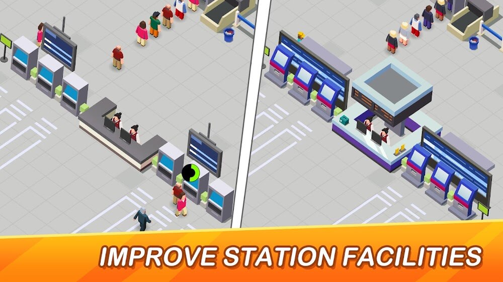 Idle Train Empire Tycoon Games Mod Apk there will be more trains running at different time frames and bringing you stable profits.Reasonable operating times: Everything in the station is under the player’s control and they must automatically set reasonable hours.STATION UPGRADESYour first job in Idle Train Empire is to upgrade some rows of seats and make them longer to allow more rows of passengers to wait there for their trains. At the same time, you also realize the oldness of the station platform to the tracks, especially the completely vacant areas that can be unlocked and used to make important rooms. So, as long as you spend a little time, the opportunity to unlock these areas will constantly appear, and your job is to add new things. Everything can bring you a small or large amount of money, so paying attention to everything in the station is completely understandable.Customize your platform: Based on buildings and décor elements, you can automatically change the location and texture.Many services are provided: A modern station gathers many things such as restrooms, restaurants and many other useful rooms.Improve customer satisfaction: Once customers enjoy coming to the station, making money becomes easier than ever. PASSENGER EXPERIENCEIt can be seen that any interior ele
