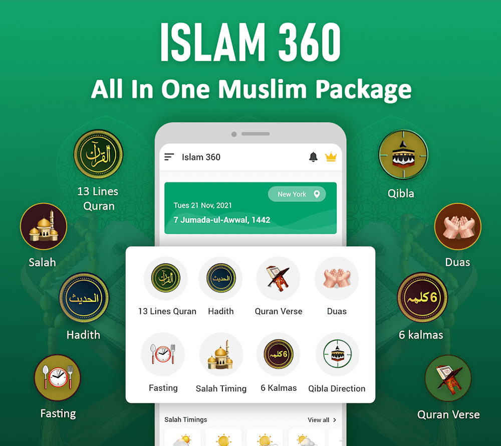 Islam 360 Quran Prayer Times apk-en of any selected hadith or loop it, and the selected segment will loop. Each hadith has an English translation. This feature helps users understand Islamic doctrine and customs.PRAYER TIMES AND QIBLA LOCATIONThis app helps Android-using Muslims worldwide pray on time by providing accurate Azan, Namaz, and Qibla directions. The app calculates the user’s Qibla distance in kilometers and degrees. User-selectable Qibla Dials are available. English, Turkish, Spanish, Russian, French, Dutch, Malay, Indonesian, Italian, Thai, and others are spoken. The most accurate prayer times are available worldwide.