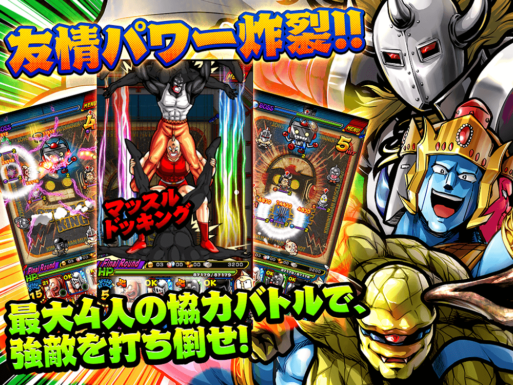 Kinnikuman Muscle Punch Premium ou will enjoy extremely interesting and attractive battles with extremely unique and diverse monsters with different interesting fighting strategies that bring you extremely fiery and epic gameplay.ORIGINAL STORY EXPERIENCEThe game will bring you an extremely attractive and interesting storyline. The plot revolves around the characters and their battles, making you fascinated and immersed for hours without feeling bored.Iconic scenes: You will come to the iconic battles of the game, the battles of th