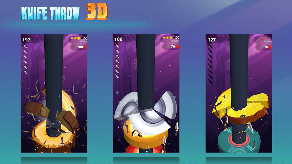 Knife Throw 3D will be a game that can give its players the highest level of entertainment experiences through created engaging challenges. If you are a lover of simple games that can bring satisfying experiences, this will be a perfect choice that you should not miss. With this game, players can participate in special challenges where they can use their swords to penetrate thick wood. If you are a new player with the first login, you will not need to worry because the ability to control the game is effortless. With just a touch