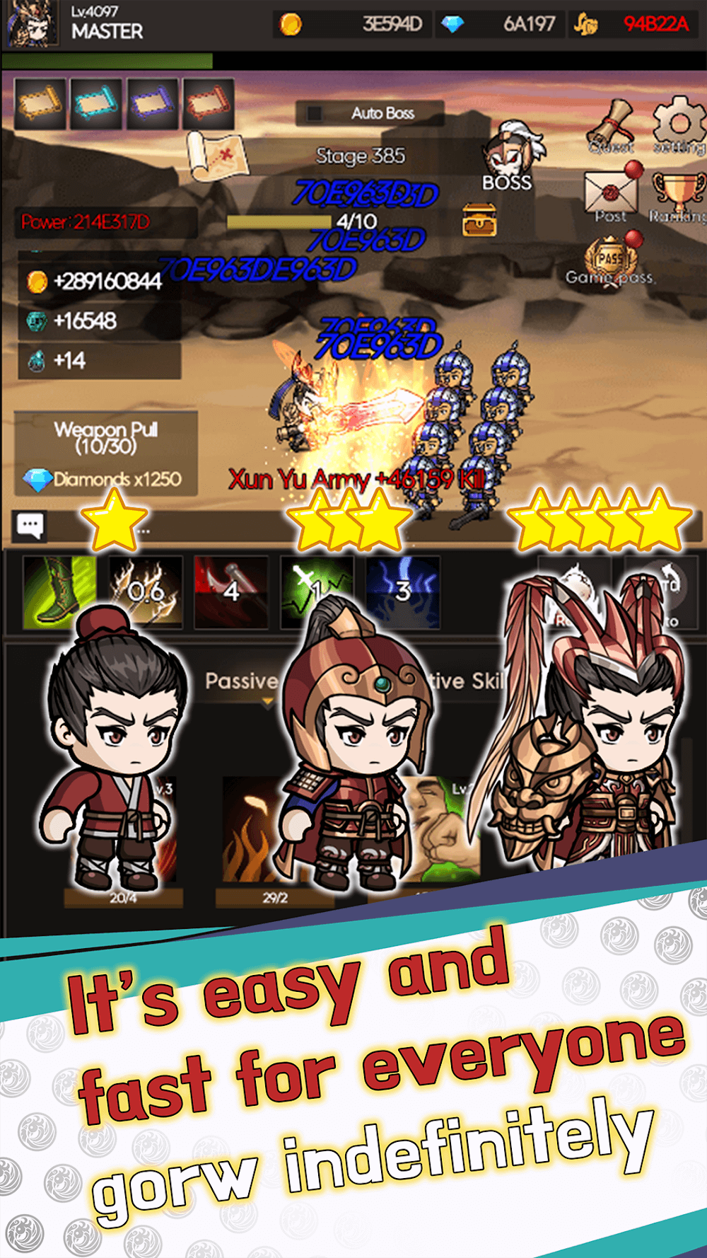The game allows players to become a hero in a chaotic situation. Here, everything is decided by strength, and you have to upgrade it with powerful equipment. The battles will be increasingly diverse, with interesting modes that cannot be missed.INFINITE AND EASY GROWTHPlayers will accompany an anonymous character in the world of the three kingdoms. From there, they will have to ensure the development of the character by participating in many diff