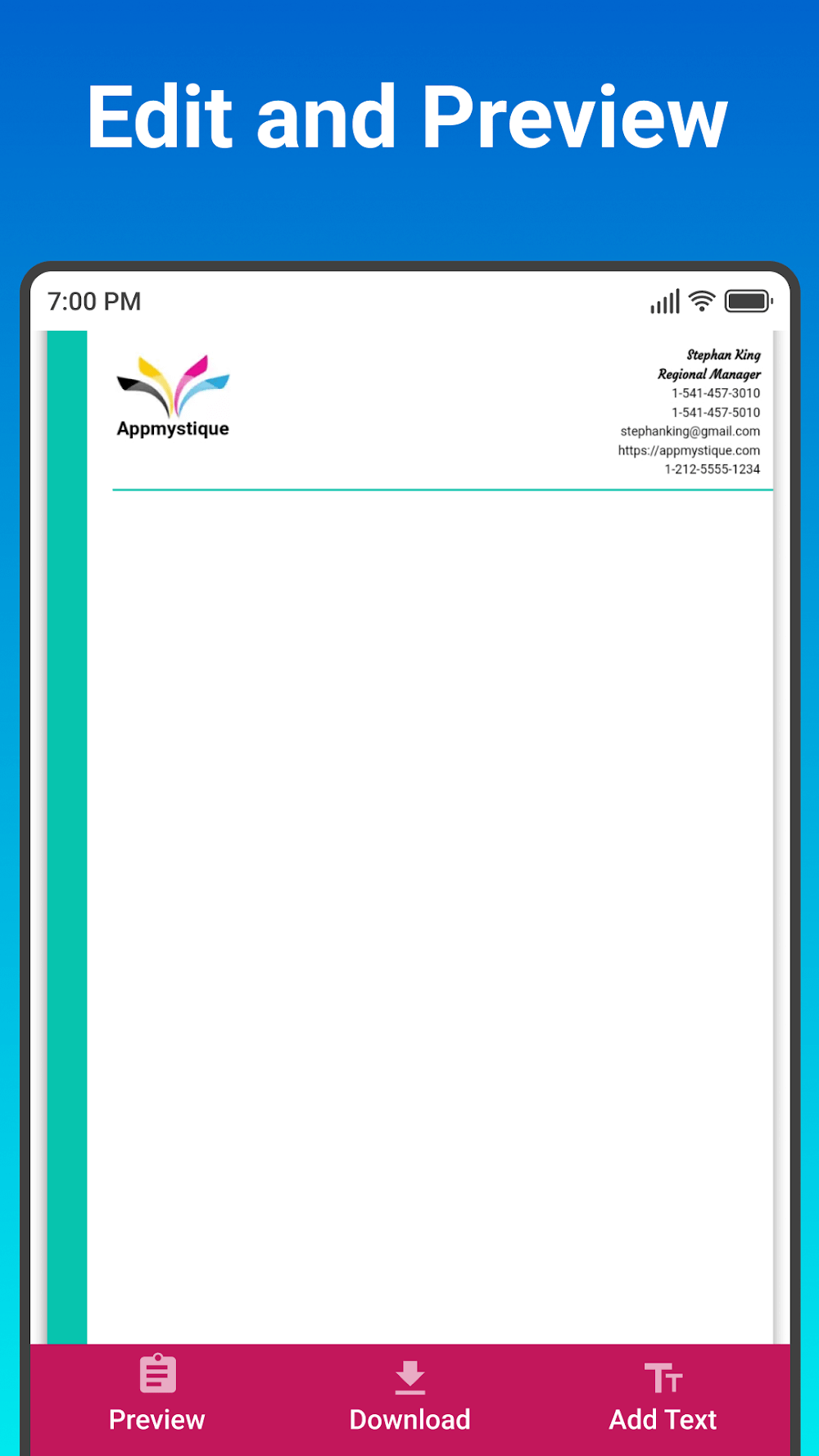 Letterhead Maker apk-en n easily identify the article’s main content. The application allows you to send titles via email or share in many available modes quickly and conveniently.STORE YOUR DATAAll your edited content will be stored in the local phone data. You can completely find old designs and favorite font options for new content. The professional designer with modern and fresh templates allows you to make your own impressive header. The updated paper templates are free and allow you to customize them according to your requirements.