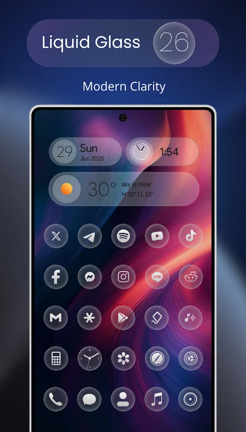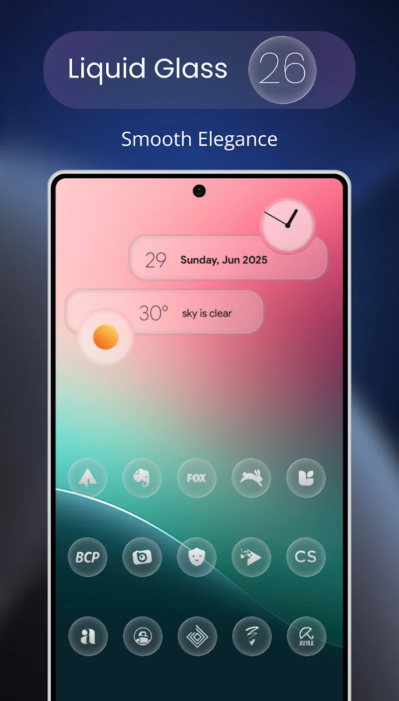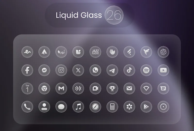 Liquid Glass 26 Round Icons Premium ix pastel colors to create the exact color style you want for your icons right in the app.Elegant Cohesive Look: Every icon is designed with a focus on its appearance to look elegant and make your device feel more modern.EXTENSIVE CUSTOMIZATIONThe app lets you update new interfaces or icons to your personal collection. You can also share your favorite icons with other devices for a better experience. The app encourages you to c