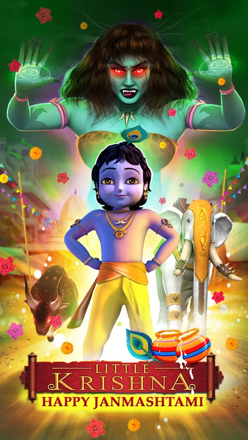 Little Krishna Premium CK CHARACTERS AND POWER-UPS FOR AIDWhile journeying, collect coins to unlock Krishna’s famous companions like Balram. Each character lends unique abilities to turn the tide in your favor. Power-ups like temporary invincibility or powerful blasts offer further aid against enemies and hazards. Use these boons wisely when the going gets tough! Combine your friends’ powers with Krishna’s agility for maximum impact. And save the best for epic clashes with Putana herself!VIBRANT 3D WORLDS AND FAITHFUL CHARACTERSLittle Krishna beautifully brings the lush colors of Vrindavan and charming character des