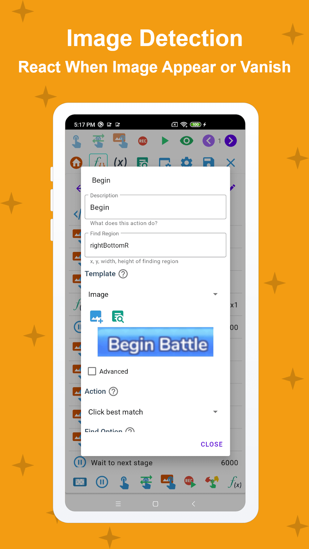 Macrorify Image Auto Clicker apk-en action swiftly.PUT IN SOME CODES FOR MORE ACTIONSYou are welcome to write code in this app, although doing so is not necessary. To put it another way, learning how to utilize EMScript is a piece of cake. After you have mastered the art of using this to your advantage when developing macros, your creative potential will no longer be constrained. Some scripts will help the process perform better and faster in some cases, giving you more ideas to automate some processes.